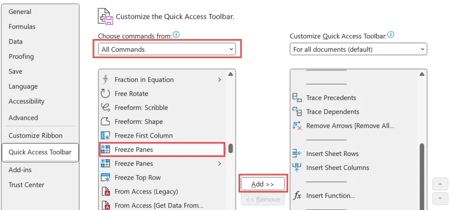 - In the “Choose commands from” dropdown, select “All Commands.” Scroll down to “Freeze Panes,” select it, and then click “Add >>.”