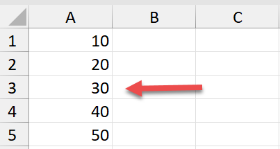 Let’s say we have data in cells A1 to A5. We want to get the value in cell A3 using the Excel OFFSET function.