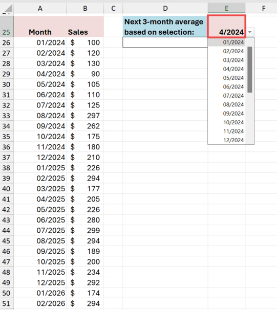 Imagine you have monthly sales data in column A. You want to calculate the average sales for the three months following the selected month in the drop down in cell E25.
