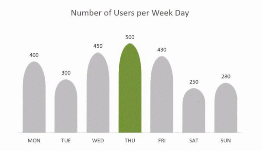 Notice that the week days with the most users, Thursday for example, has a stretched out tip as compared to Saturday. This is standard behavior if you try to use shapes or images for the bars.