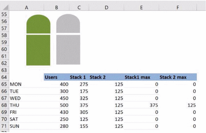 The formula in my example for Stack 2 is =MIN(users)/2. This ensures that the tip for all the bars will remain the same. To get the bar conditionally formatted, i.e., to highlight the maximum, you need to introduce two sets of series using the max formula. The green series needs to be plotted on the secondary axis, otherwise they will end up as stacks on top of the original series (the grey ones).