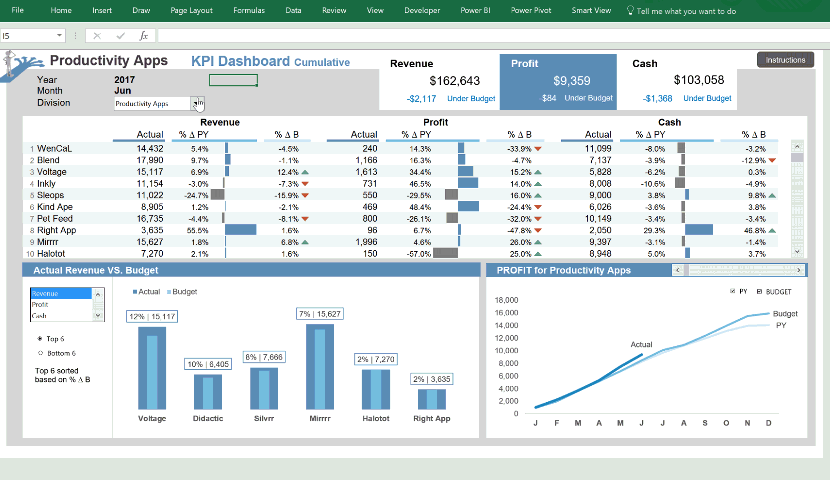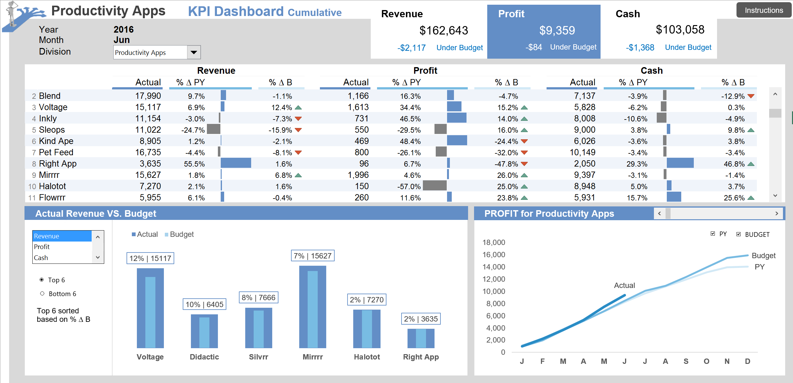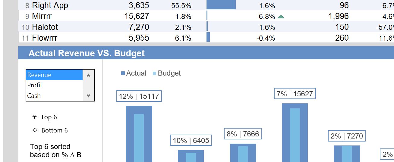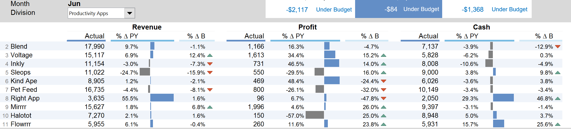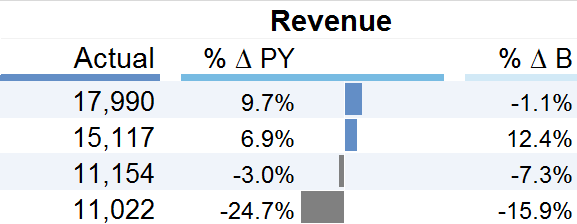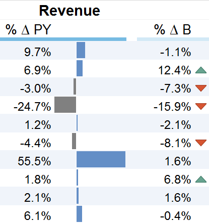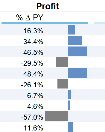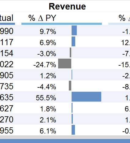 This example shows %ΔPY grouped with its visual (a conditionally-formatted bar chart), to imply they are connected.