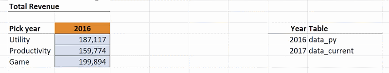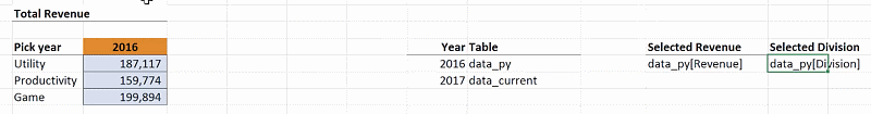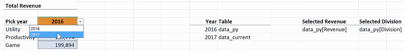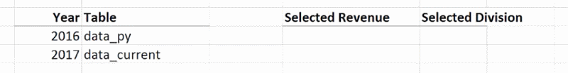 This gives you data_py[Division]. You will notice that if you change the year to 2017, the values in cells K15 and L15 automatically change to data_current[Revenue] and data_current[Division]. These can now be used as the reference text for your INDIRECT function.
