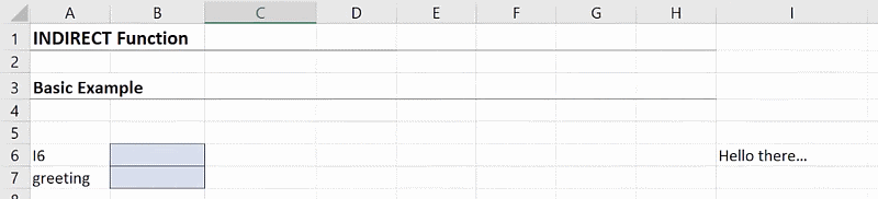 The beauty of INDIRECT is its dynamic nature; if the content of the referenced cell changes, the output of your INDIRECT function will update automatically. For example, changing “Hello there…” to “Hello there!” in cell I6 will reflect in cell B7 immediately.