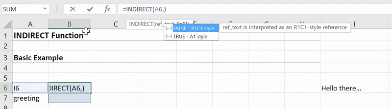 If you go to Cell B6 and enter the formula =INDIRECT(A6), it will display “Hello there…”.