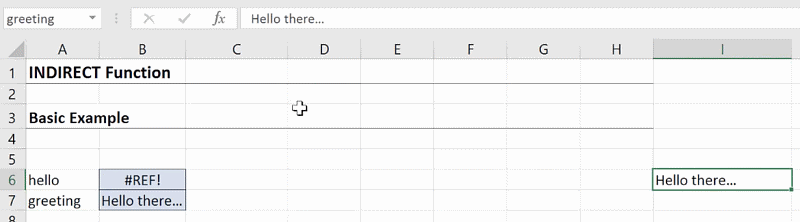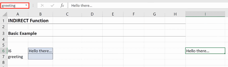 For example, after naming cell I6 as “greeting”, you can refer to it as “greeting”. To see how this works with the INDIRECT function, enter this formula in cell B7: