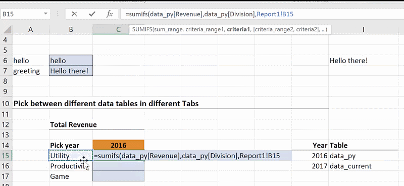 The aim is to make the SUMIFS function dynamic so that when you select the year 2016, it goes to the tab containing 2016 data, but selecting the 2017 sends it to the other tab. Go to the helper cells and write down the years that are specified in the dropdown option, 2016 and 2017. Specify the name of the data table corresponding to each year.